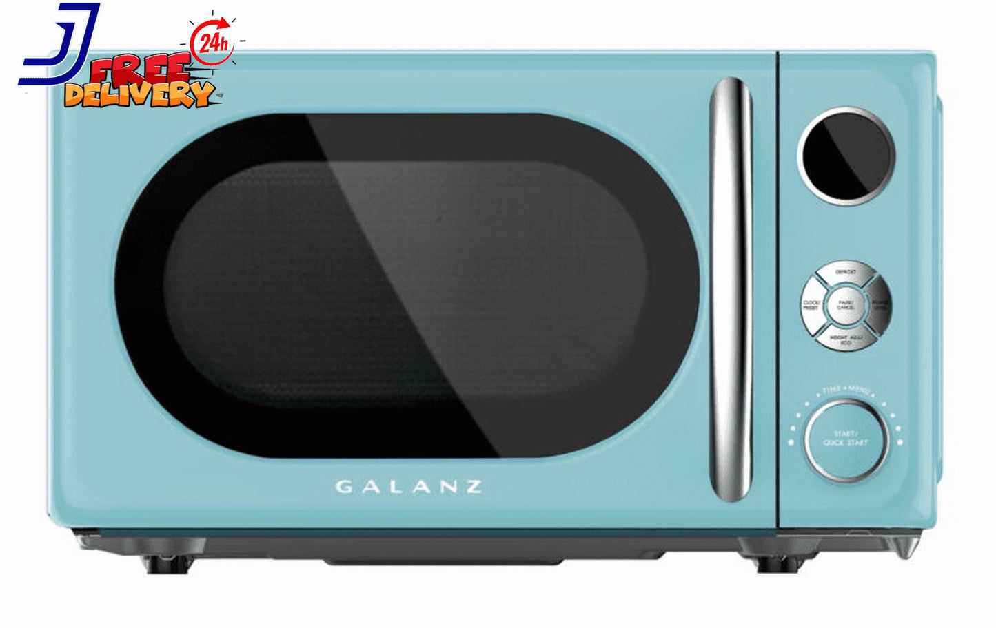 Galanz Retro 0.7 Cu ft Countertop Microwave oven in Blue makes cooking and reheating meals or beverages simple, quick, and convenient. With adjustable power levels, defrost program and weight adj., this microwave oven offers a variety of choices to complete your cooking tasks. The fun Retro design brings a look and feel of the fabulous old days, adding style but still function in your modern kitchen. It is a fun and stylish addition to any kitchen, rec room, home office or dorm room. Condition: New.