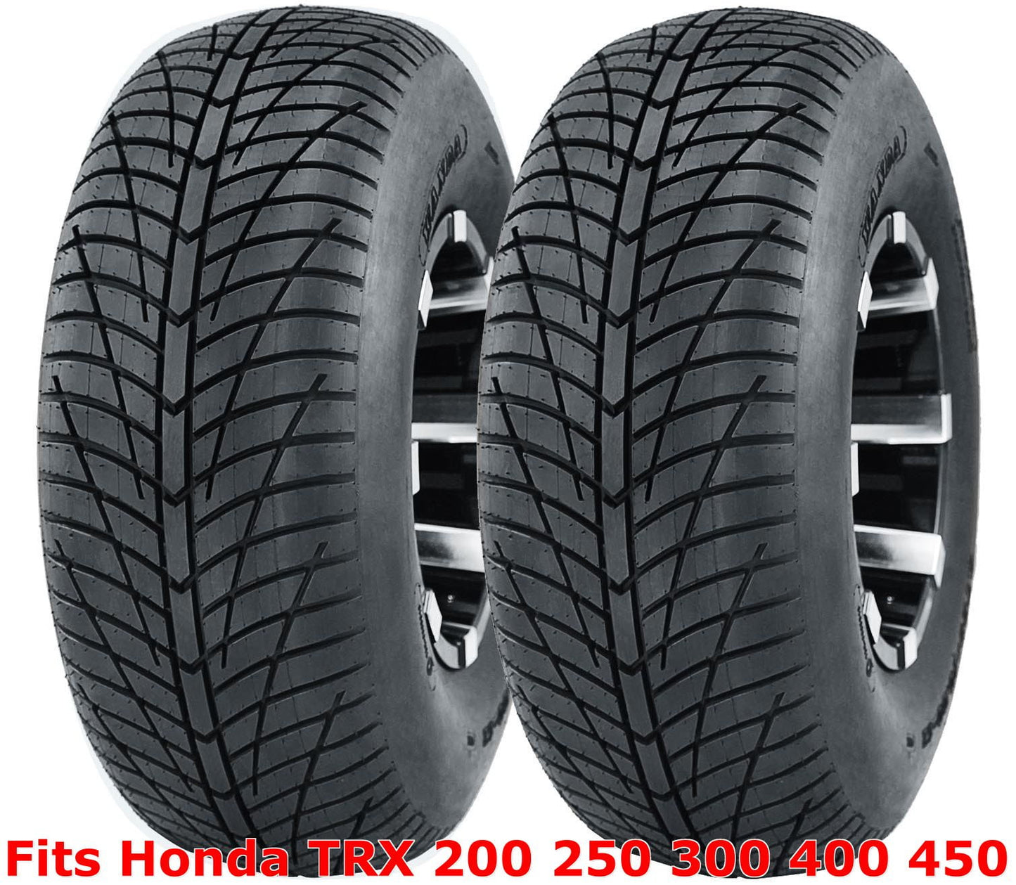 Set of two 21x7-10 ATV tires fit for Honda TRX 200 250 300 400 450 front. Directional tread pattern provides predictable traction on any hard terrain. Lightweight ensures maximum acceleration. Tires only, no wheels included.