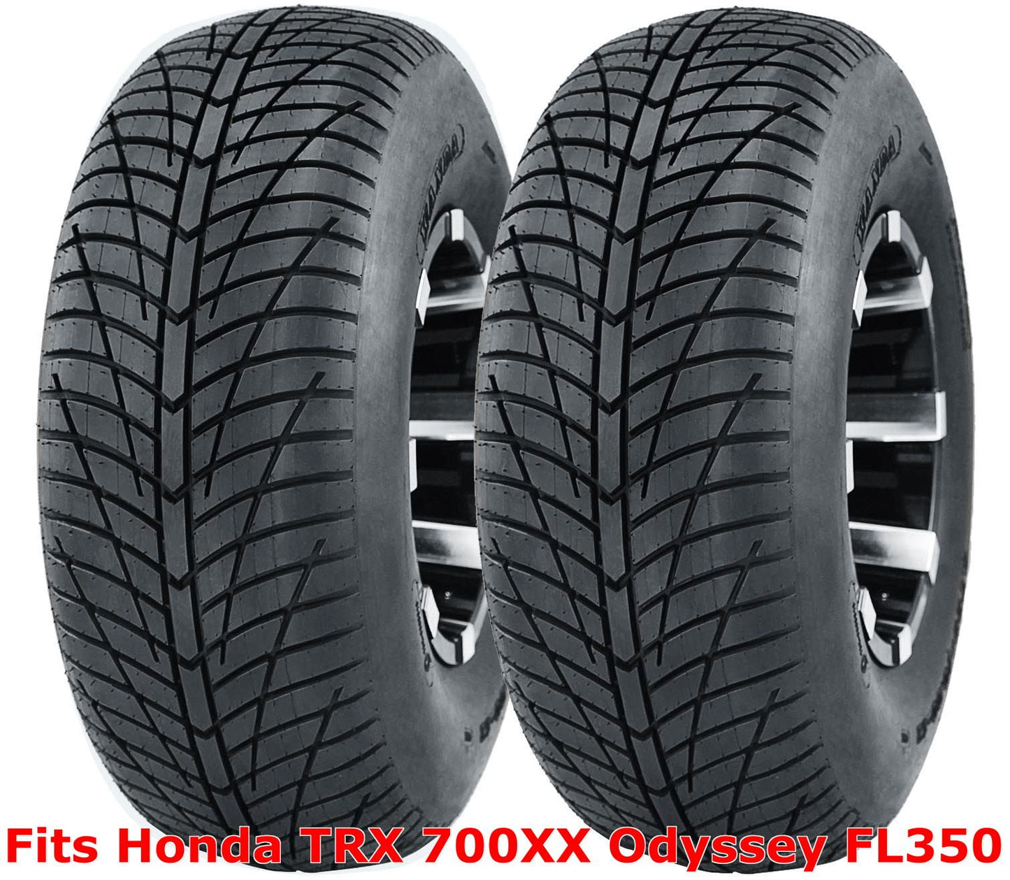 Set of two 21x7-10 ATV tires fit for Honda TRX 700XX Odyssey FL350 front. Directional tread pattern provides predictable traction on any hard terrain. Lightweight ensures maximum acceleration. Tires only, no wheels included.