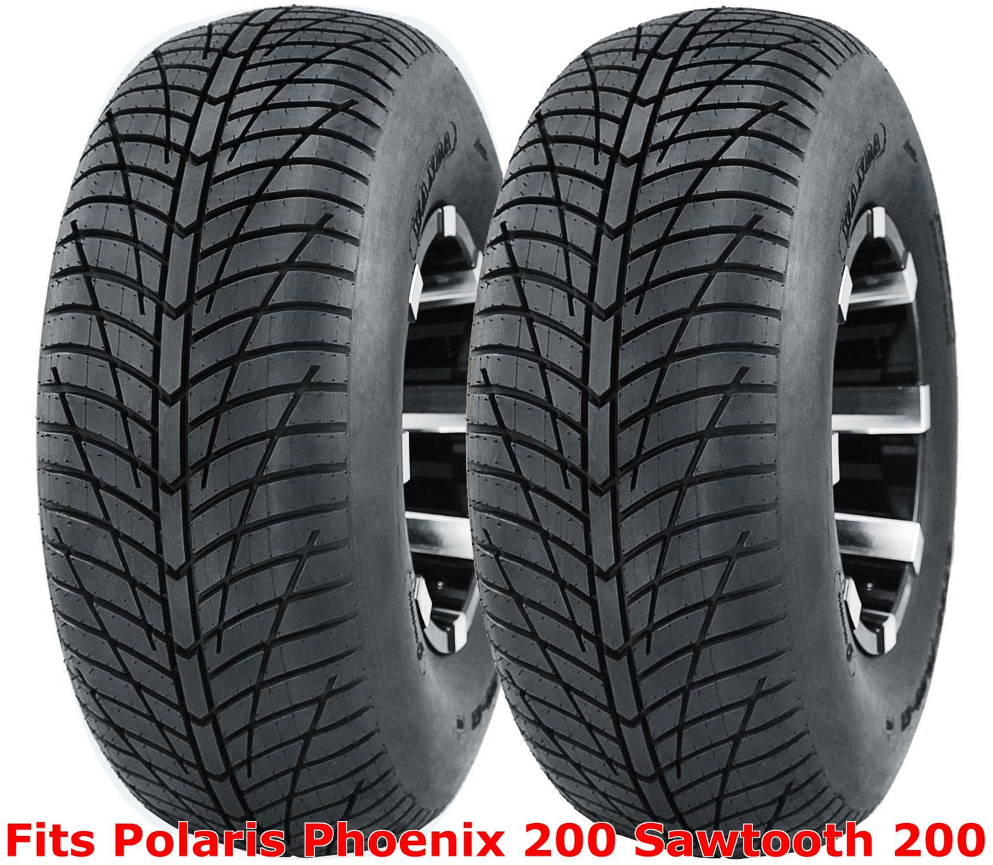 Set of two 21x7-10 ATV tires fit for Polaris Phoenix 200 Sawtooth 200 front. Directional tread pattern provides predictable traction on any hard terrain. Lightweight ensures maximum acceleration. Tires only, no wheels included.