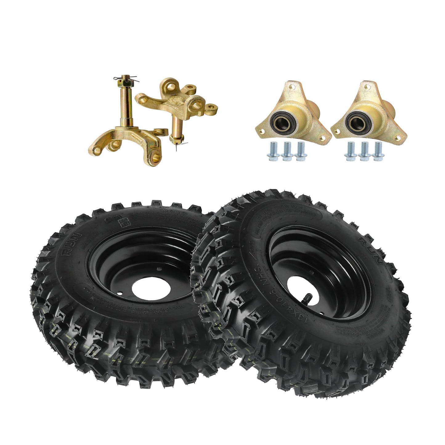 Product Description 6 inch Wheel 13x4.10x6 13x4.10-6 Wheel Tire and Rim 3 Stud 4Ply Tubeless Wheel for Snow Blower Thrower Mini Bike ATV Quad Buggy Go Kart Tire Wheel Four Wheelers 4 Ply Rating , Tubeless Max Load: 130kg (290lbs) AT 170 kPa (24psi) 3 Stud Iron Rim, Mounting Bolt Spacing: 78mm/3.07" Center Hole Diameter: 54mm/2.1" OD of the Wheel : 340mm/13.4 Package includes : 2x wheels and Tires, 2x front wheel hubs, 2x steering knuckles