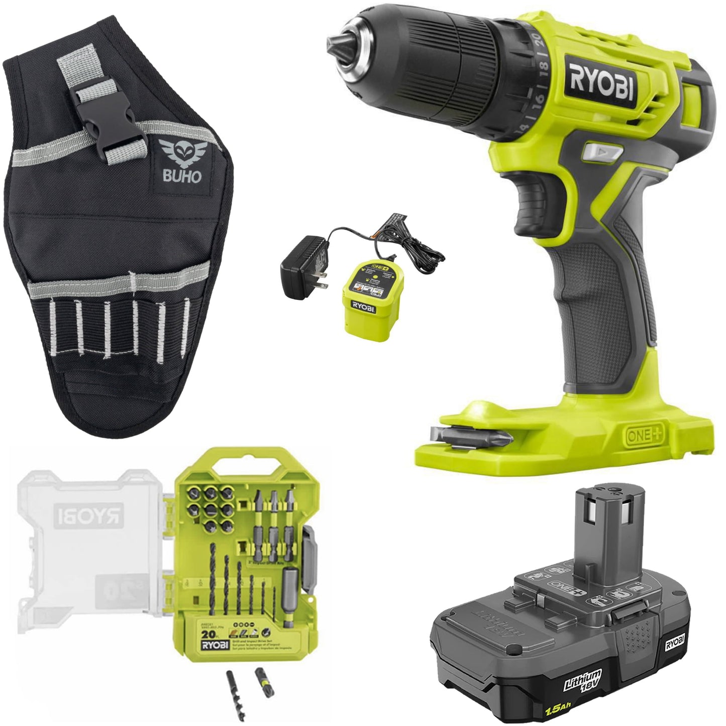 Drill Set Bundle with Ryobi 18V ONE+ Drill Driver, Multipurpose Drill Bits, 1.5 Ah 18-Volt Battery, Charger and Buho Drill Holster