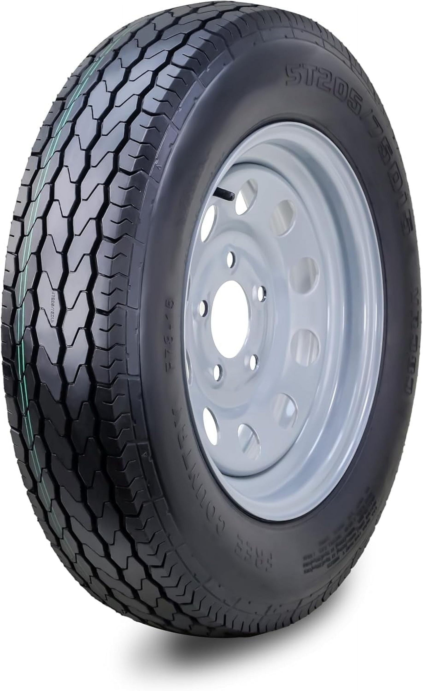 Free Country Trailer Tire Wheel Assembly ST205/75D15 6-Ply C 101L 5 Lug on 5" PCD Balck Mod Rim . DURABLE: 7.4mm deep tread depth vs 5.6 mm of other cheap competitors, durable and longer mileage life; PERFORMANCE: 6 ply rated, load range C. Load Index:107. Speed rating L--up to 75mph; WHEEL DETAIL: 5 Lug on 5" bolt pattern, offset: 0, style: Silver Mod; SAFETY CERTIFIED: Meets or exceeds applicable DOT standards to provide dependable performance season after season for hauling cargo safely.; 0