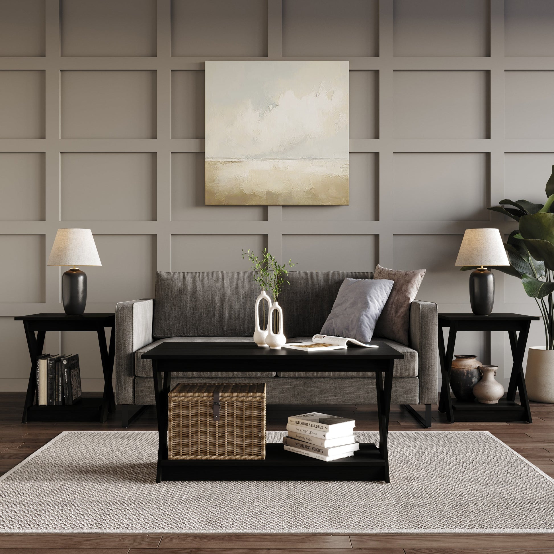 Elevate your living room with this 3-piece coffee table set. The wide plank coffee table has bold crossed-leg supports for style and stability. Two matching end tables echo the same design. Each piece includes a lower shelf for books, baskets, or decor. End tables measure 17.7" W x 17.7" D x 21.7" H, perfect beside a sofa or chair. This set combines style and function for modern living.