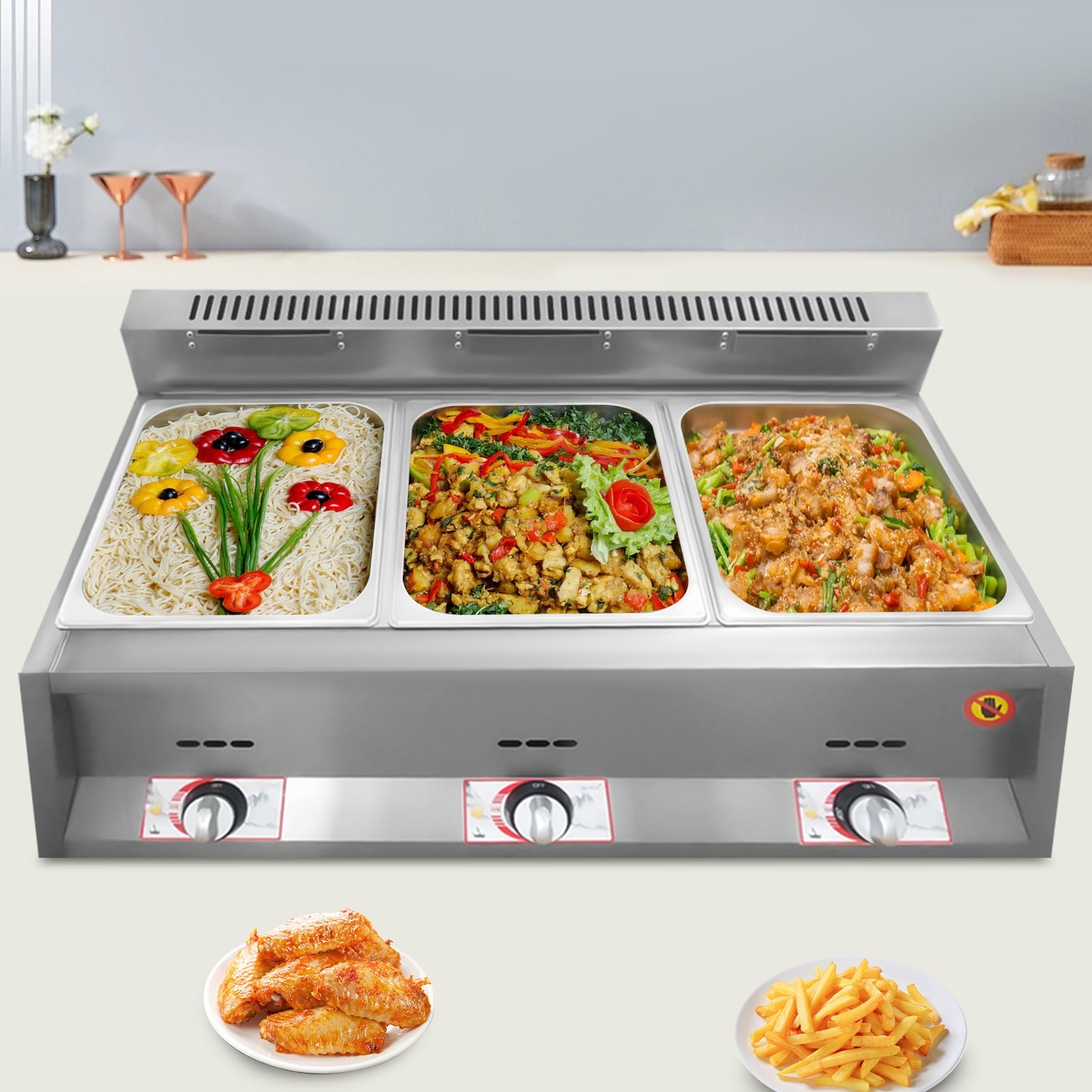 Made of high-quality stainless steel material, this food heating pot is easy to operate and will be a great addition to your catering business. Adjustable firepower and three food pots provide enough temperature and space to fry or heat food, making it a great choice for catering, family dinners, and holiday parties.
