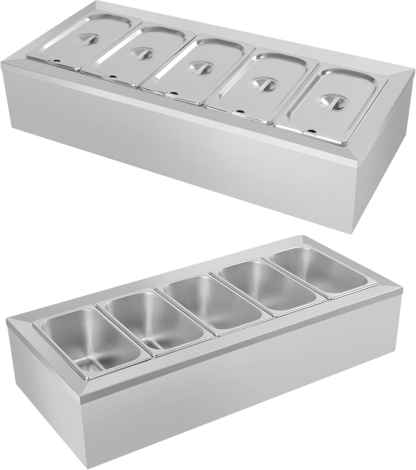 - 【Function】Condiment dispenser container holder with 5 1/3pans and lids . Withstand both low and high temperatures, fit any hot cold food. Organizer for food, spices, seasoning, sauce, salad, jam, fruits, Ingredients. For home kitchen, banquet hall, buffet, party gatherings, restaurant, hotel, barbecues, baking, dessert shop, rv, cafeterias, hotpot shops, milk tea shops, fruit shops commercial ect.