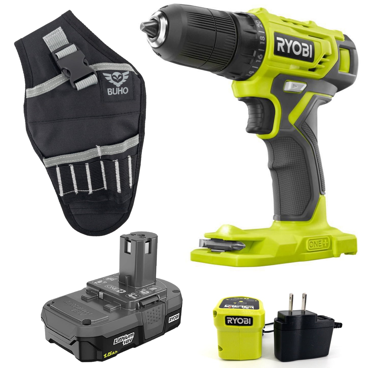RYOBI 18-Volt ONE+ Cordless 3/8 in. Drill/Driver Kit with 1.5Ah Battery and Charger. The drill/driver features a 3/8 inch keyless chuck with a 24-position clutch that adjusts torque output to control the depth of the screw or fastener. Its compact design allows you to work in tight spaces. It also has an LED light to illuminate work surfaces and on-board bit storage for convenience. This kit is powered by a 1.5Ah lithium-ion battery that delivers fade free power. Best of all, it's a part of the RYOBI ONE+ System of over 280 cordless tools that all work with the same battery platform. The BUHO Drill Holster is perfect for carrying the drill safely at your side.