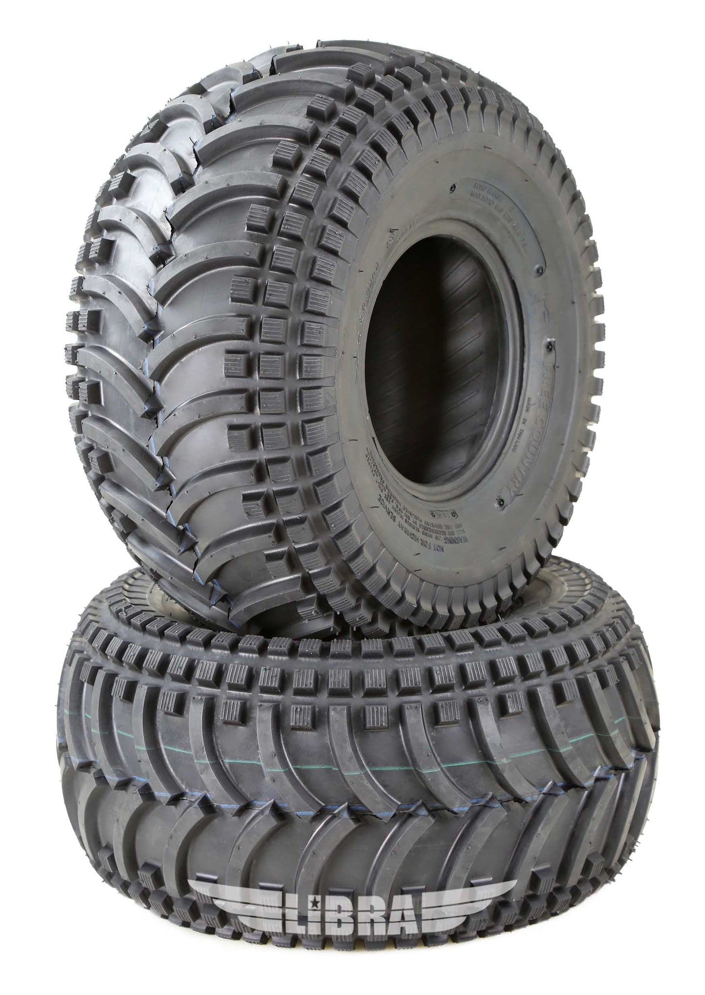 Set of two FREE COUNTRY 22x11-8 ATV tires fit for a variety of ATV applications. The specially designed deep tread provides excellent performance in mud, sand or hard terrain conditions. Low profile design provides controlled sliding and increases comfort and stability. Heavy 4 ply rated construction resists punctures and abrasions. Tires only, wheels are not included!