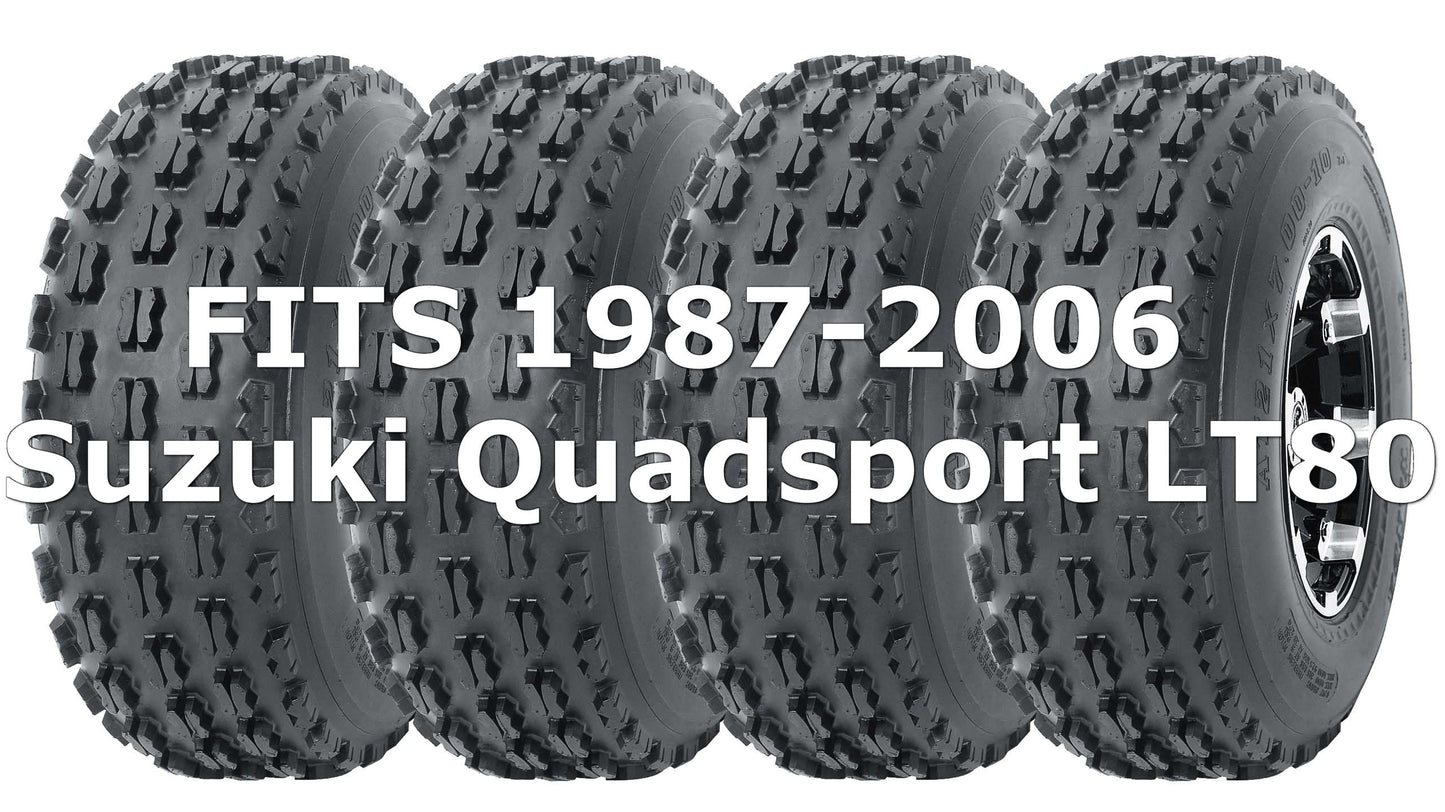Complete set (2 front + 2 rear) 19x7-8 tires with non-directional tread pattern fit for Suzuki Quadsport LT80 1987-2006. The knobs offer a superior traction and precise handling. Heavy 4 ply rated nylon construction resists punctures and abrasions. Tires only, rims are not included.