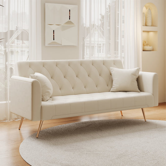 Aukfa Curved Arm Futon Convertible Sofa Bed for Home Office, 2 Pillows, Tufted Back, Velvet, Pink