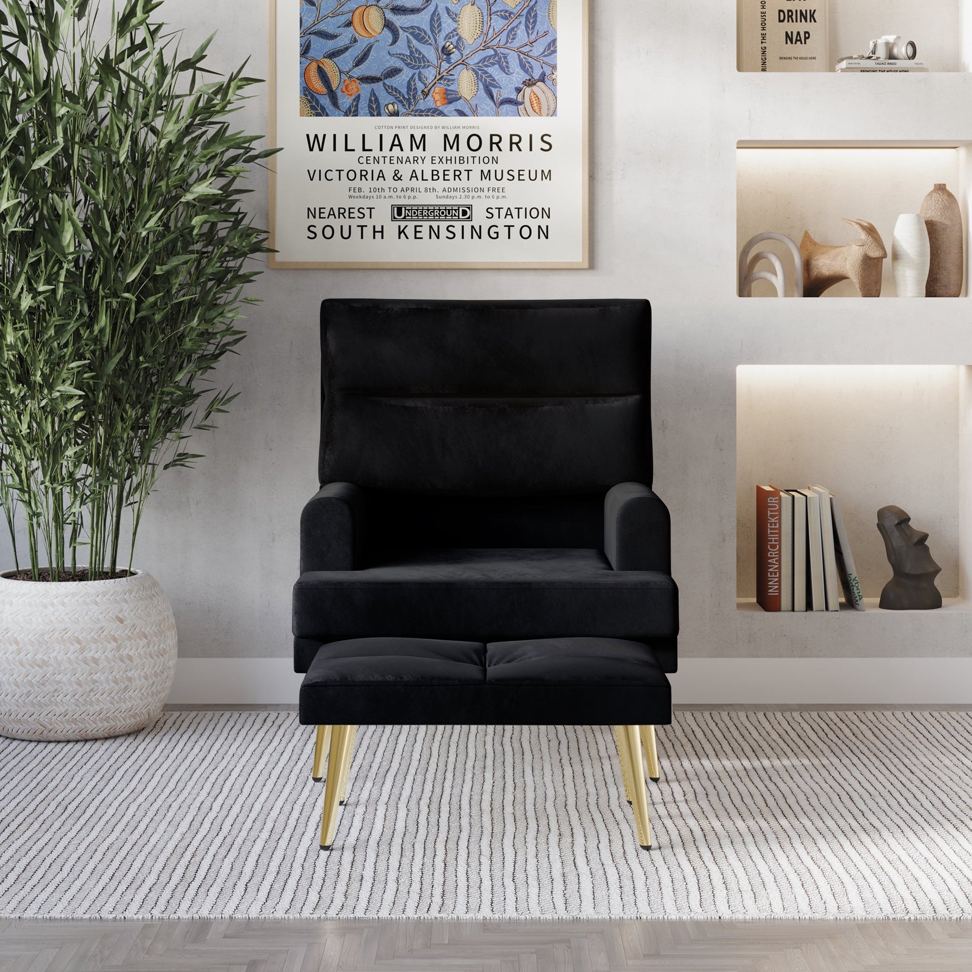 This wide recliner chair with ottoman lets you relax in style in your living room, bedroom, or home office. It comes with a matching ottoman and features high density foam to give your feet experience the ultimate enjoyment and comfortable. Both pieces are made from solid wood frame with gold metal legs for a modern edge and strong. They're wrapped in skin-freindly velvet which available in five colors: Light pink, Black, Navy blue, Silver grey and Light grey. This chair design with channel tufting and foam fill to provide plenty of support as you relax. This chair also features a round armrest while a side storage compartment is ideal for magazines and remotes control. This recliner chair can fit to 6 backrest setting from 90°-180°. This comfortable recliner chair is ship with ottoman in one convience box and easy for assembly!