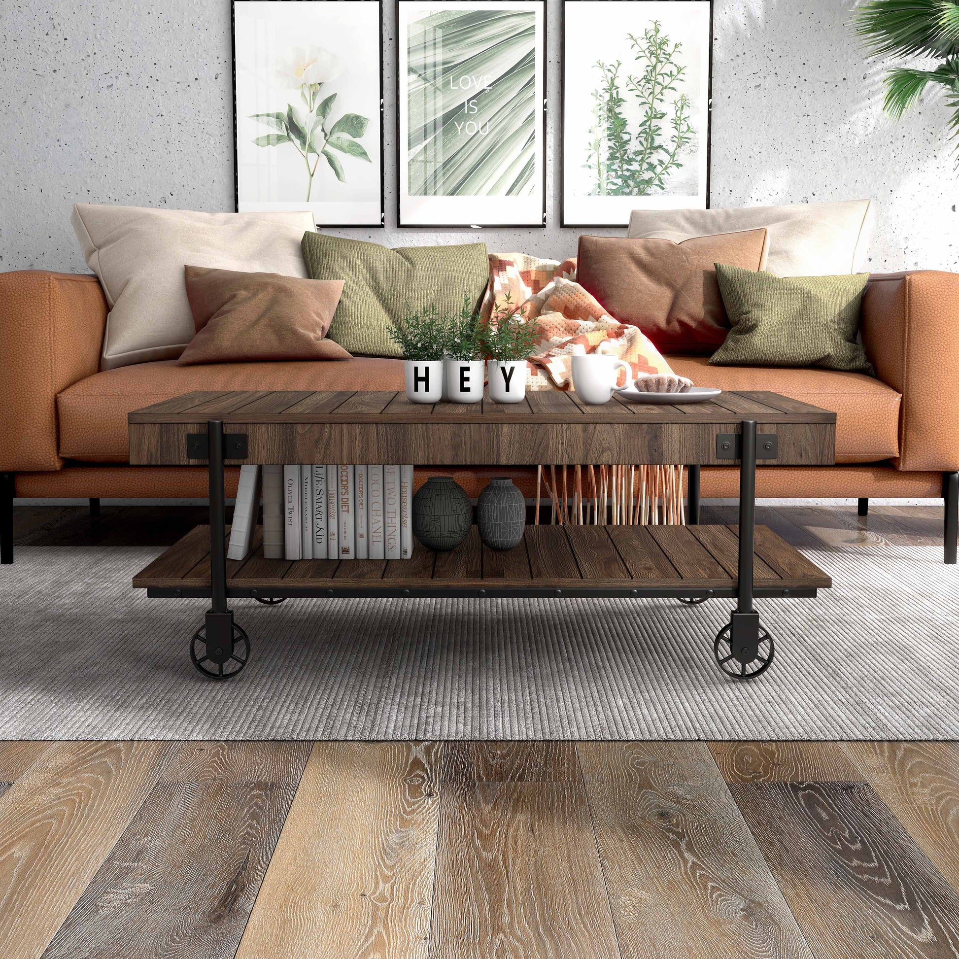 Inspired by industrial carts from a bygone era, this Coffee Table will take your interior to a new level of repurposed style. The timeless appeal of its rugged fixed metal casters and rustic wood surface make an eye-catching focal point in any room. With its planked design and rich finishing, this handsome coffee table will naturally add a touch of history to your home.