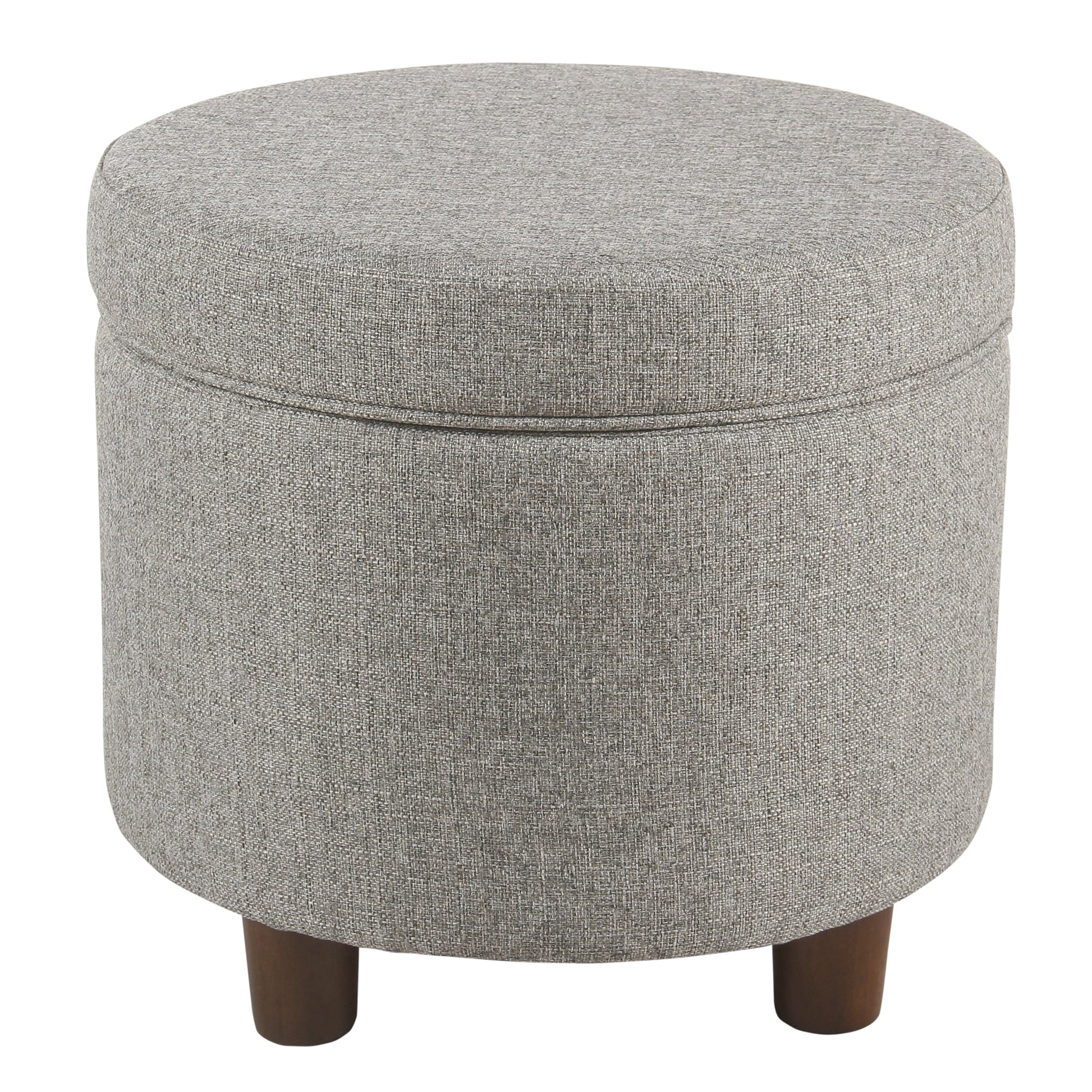 This modern round ottoman features a lift-off lid for convenient storage. Upholstered in textured tweed fabric with welting on the lid, this mid-century ottoman has wood legs in a complementary finish. Use this multifunctional storage ottoman to hide accessories in a bedroom, to store books or magazines in a living room, or to keep controllers or remotes nearby but out of sight in a family room. Pair two together for added impact. This ottoman is available in a variety of colors and is easy to assemble and maintain.